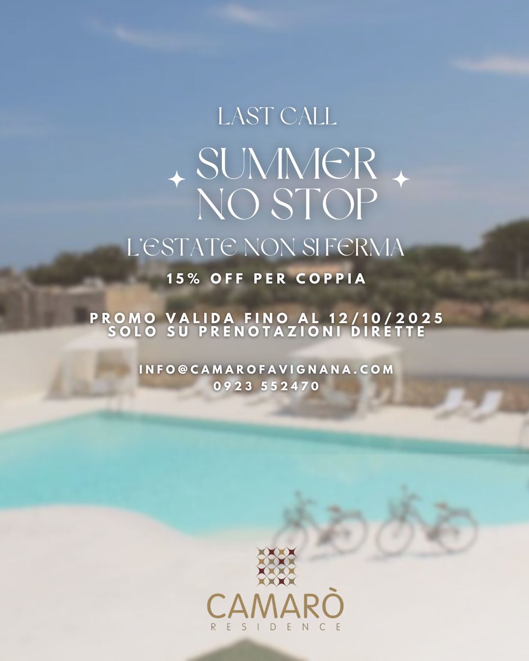 A Favignana l’estate continua senza sosta 🌊✨ Al Camarò Resort vogliamo regalarvi ancora giorni di sole, mare e relax con una promo speciale: 💛 -15% sulla tariffa di coppia 👉 Offerta valida solo per prenotazioni dirette ...